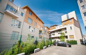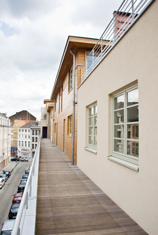 Ensemble de logements et surfaces commerciales avec coursives extérieures en plein centre avec vue sur l'hôtel de ville